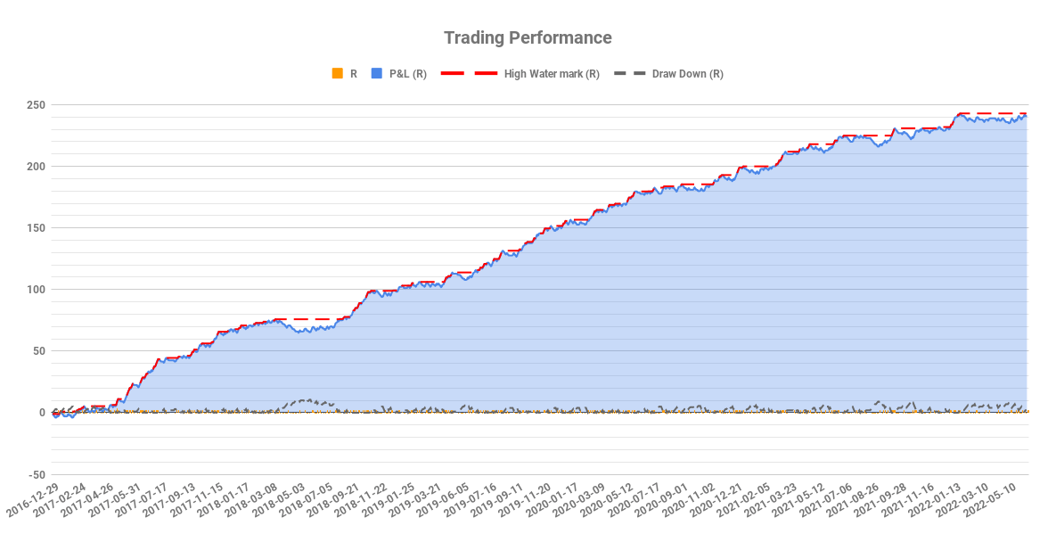 The back test shows an average win rate of 45% with a 1:2 risk-to-reward ratio. This means the strategy is profitable, but can have periods of draw down, that you will need to trade through.