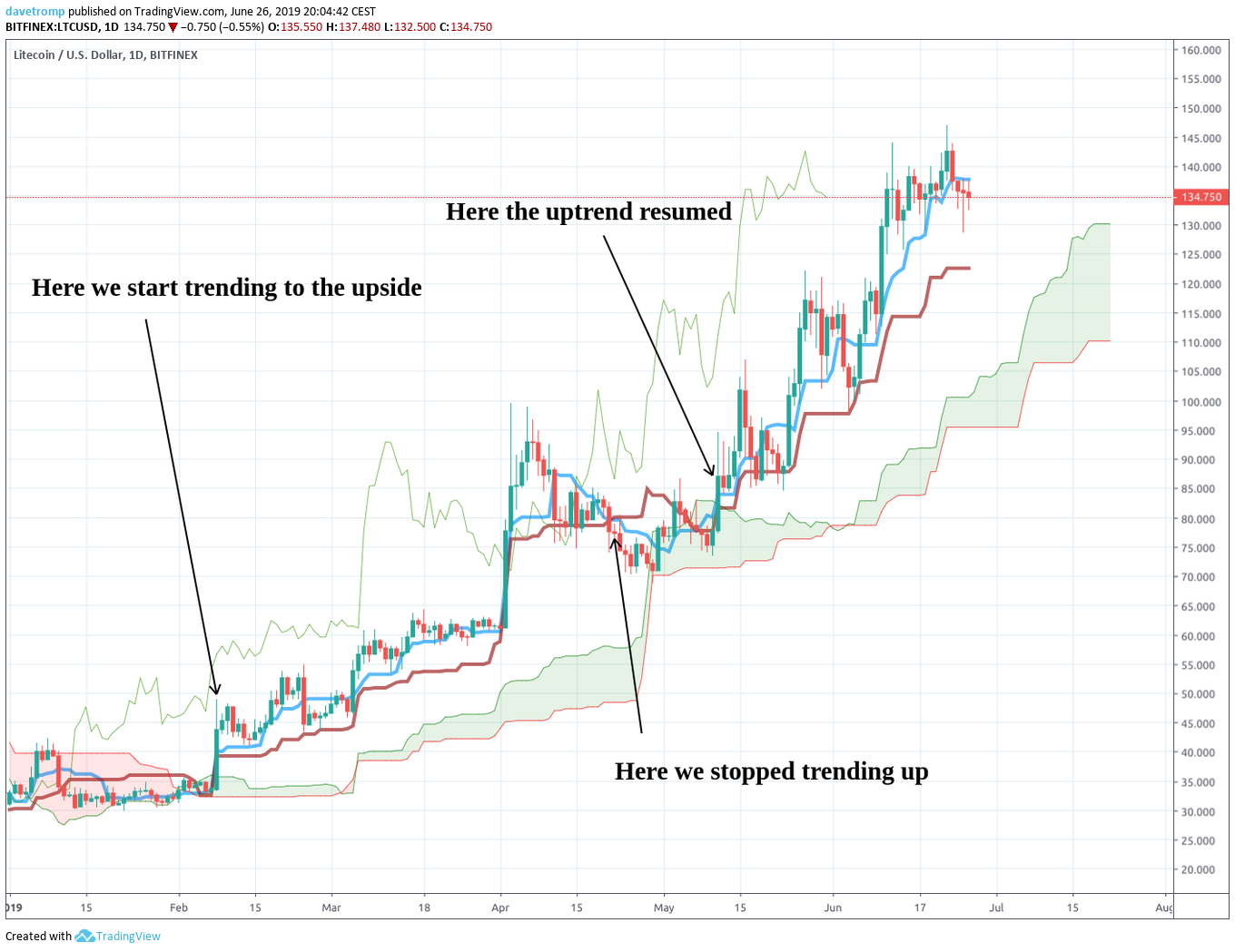 The Ichimoku Kinko Hyo is also known as the Ichimoku Cloud indicator. It is a complete trading system in itself and is designed to help a trader see what condition the market is in just one glance. Here is a very clear example again on Litecoin.