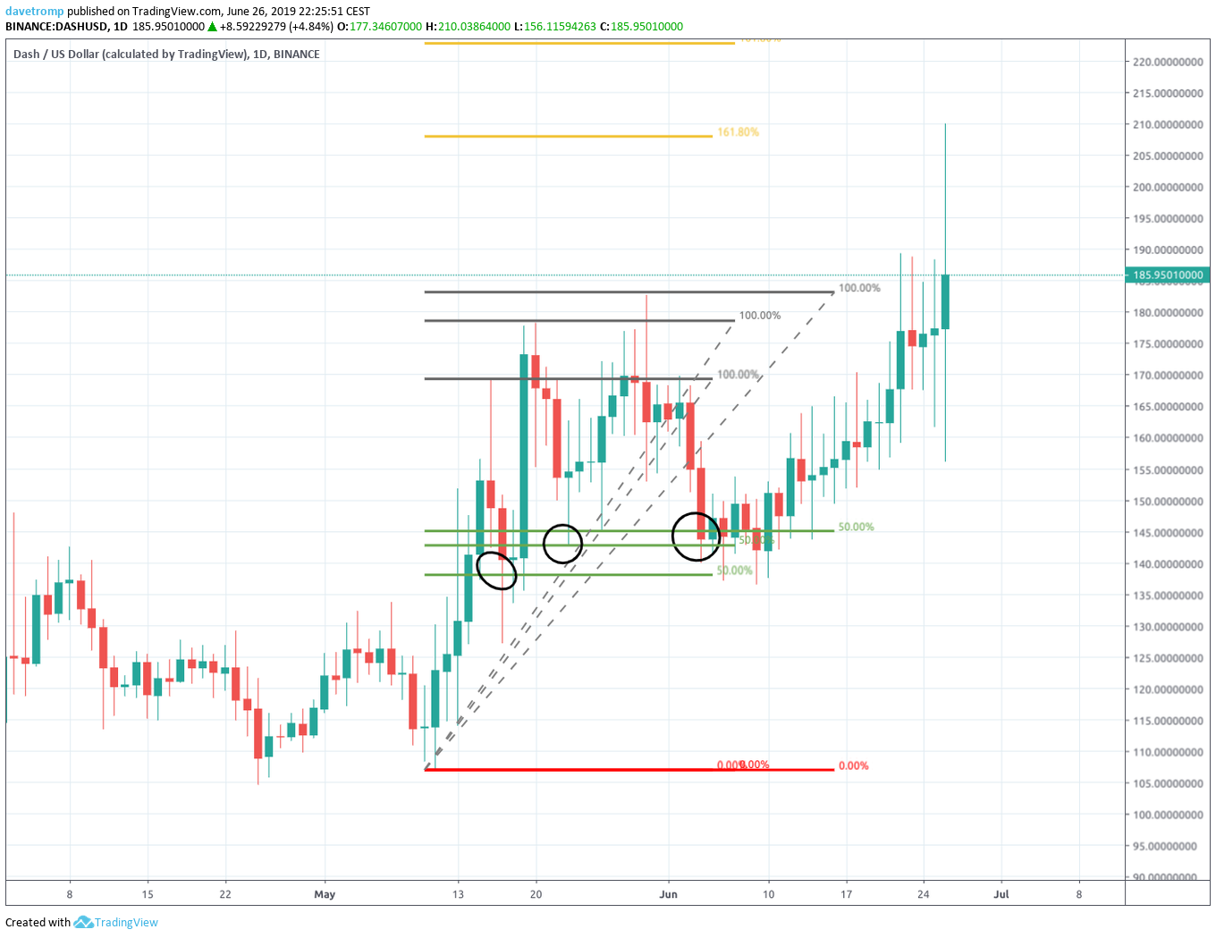 Sometimes it is better to wait for the price to come back to a lower level to buy more cheaply. If the price takes off, you will miss the trade, however. Here is a trick of how I get into trades at better prices. I use the 50% retrace of the current swing, which I measure with the Fib retracement tool. I keep moving my entry order up as prices move up in an uptrend. This can give multiple trade opportunities. See the chart below for an example.