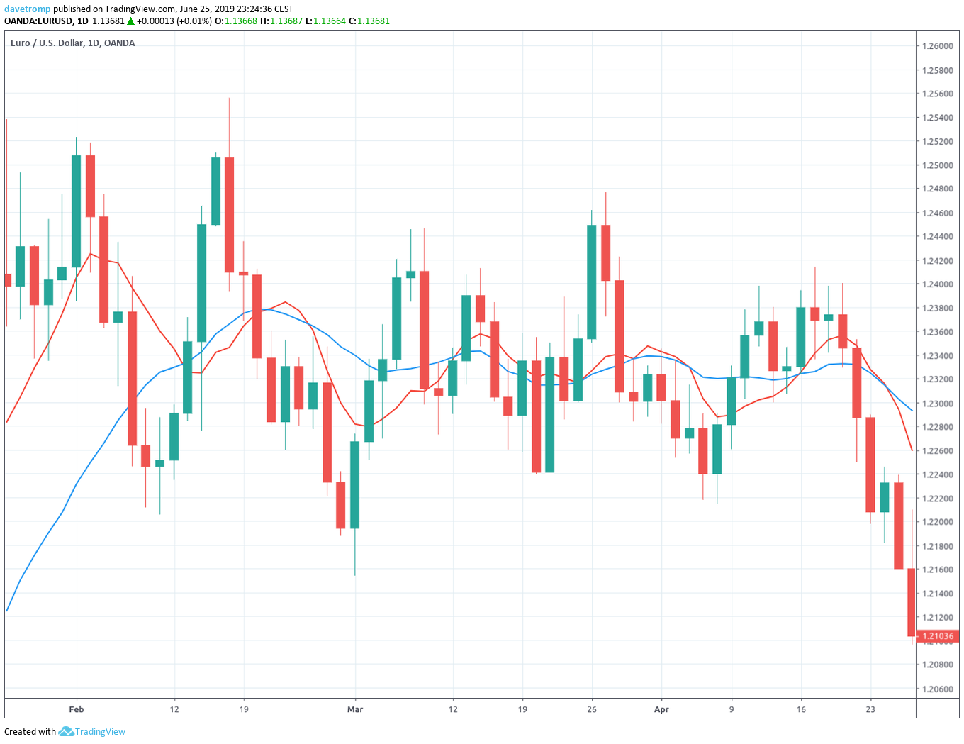 The fast SMA, as well as the price itself, is turning around the slow SMA. The slow SMA is pointing down so this could tell us the predominant trend is down. If I see this I sometimes change the 8 SMA to a 50 SMA. This now makes the 21 SMA the fast-moving average and the 50 SMA the slow one. Then normally everything becomes clearer again. See the below chart for an example with the 21 and the 50 SMA.