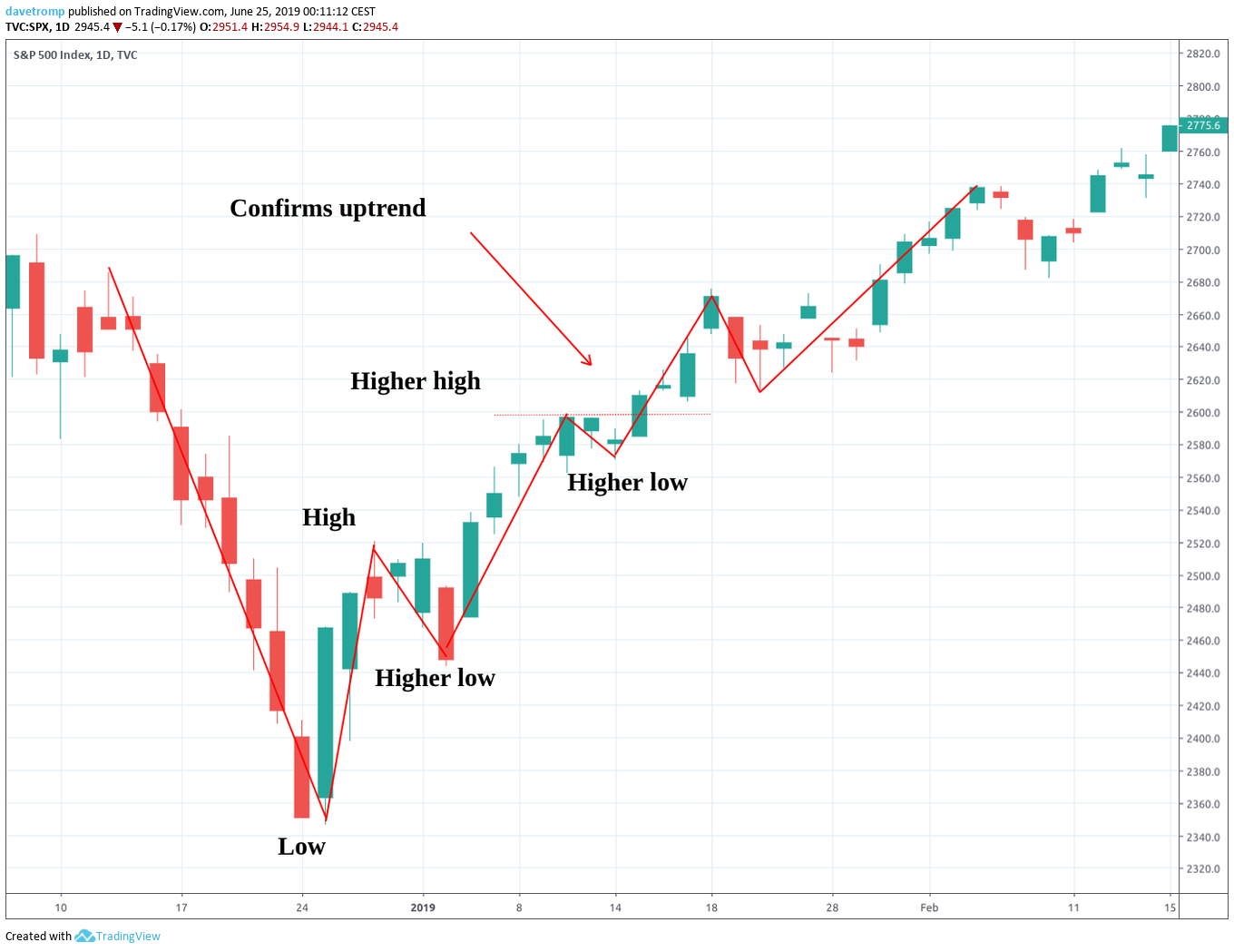 An uptrend is confirmed once the price has made a higher low and a higher high.