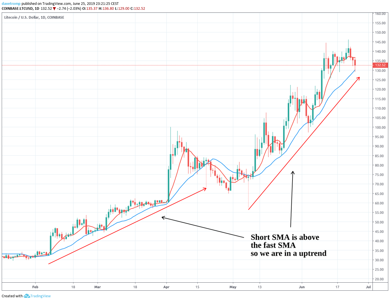 There are two ways that I use moving averages to help me identify the direction of the trend.