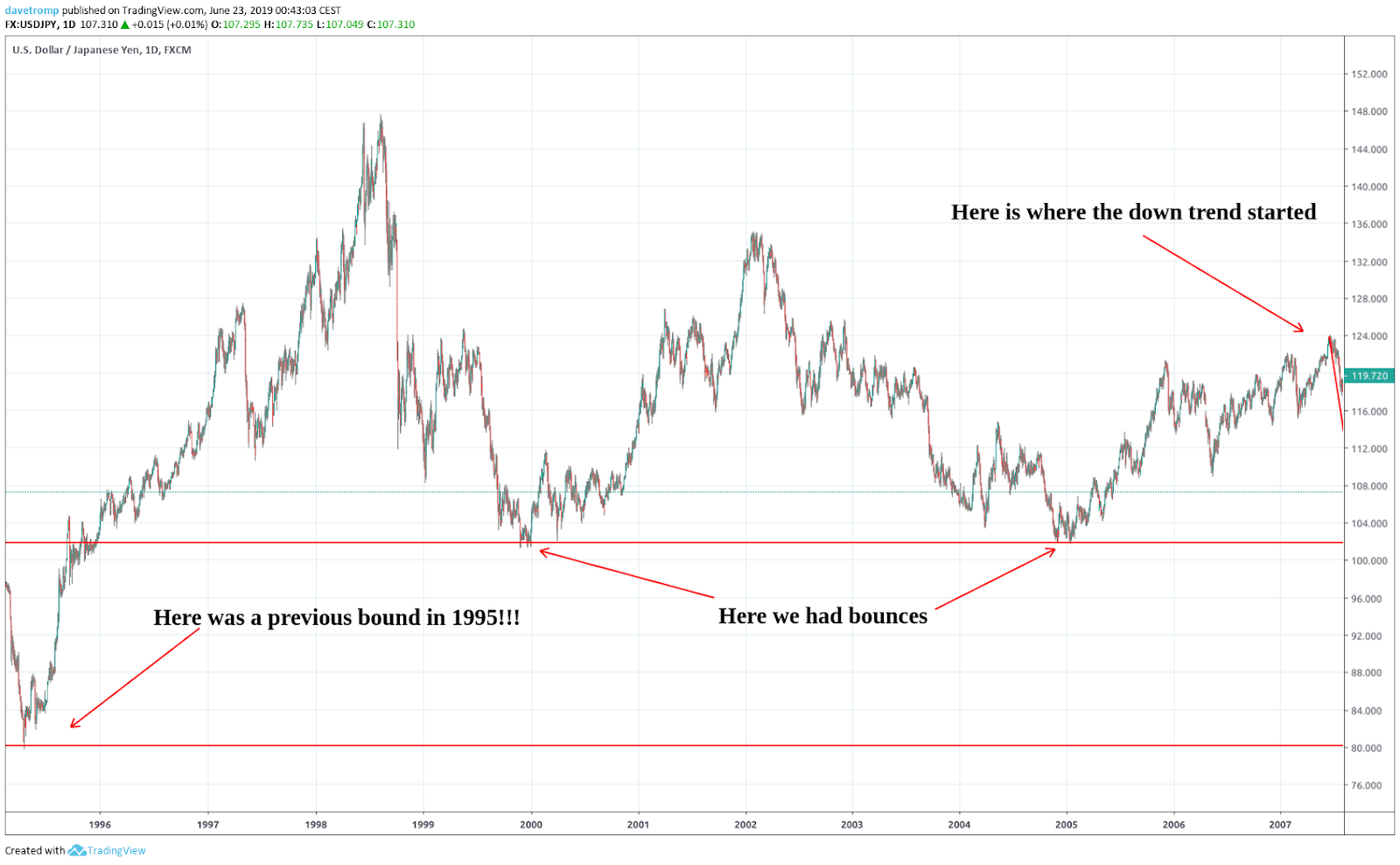 Here is the same chart, but then zoomed out and scrolled back to 1995. Looking left we see two levels where price obviously bounced. Now let’s go back to our trade on the chart.