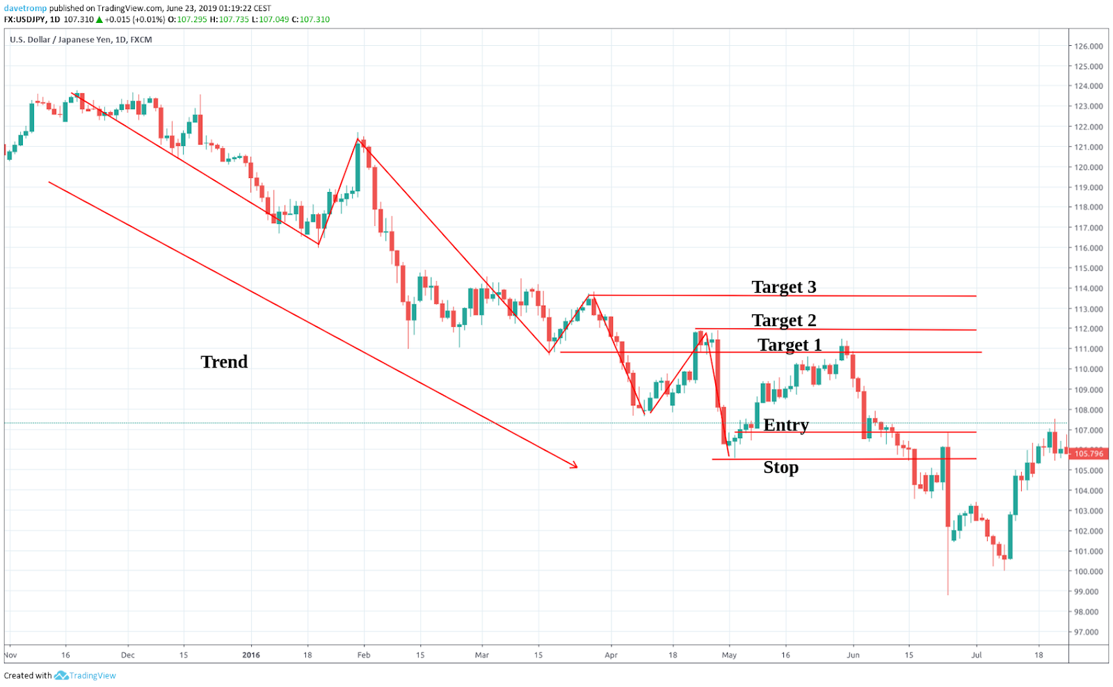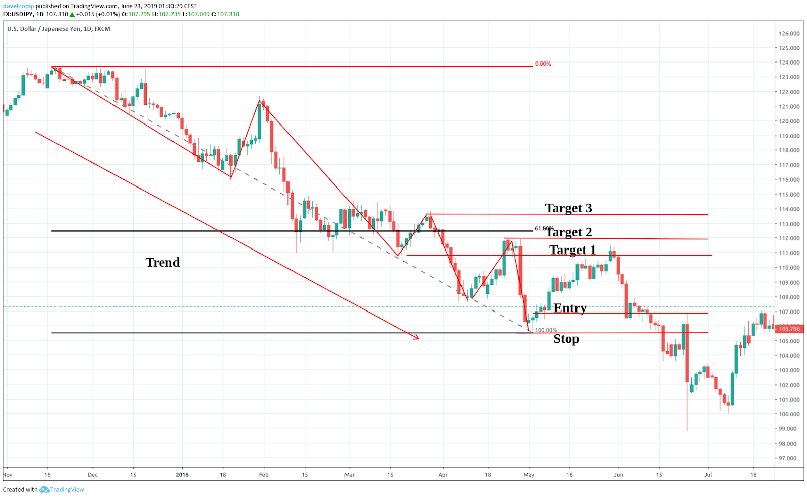 As you can see price only retraced to target 1 before continuing on lower. So If the first target level is enough to make a good return I would use that as my take profit target. However, if a trend has been going on for some time, the retraces can be deeper. It takes some experience trading a particular market to understand if there is a higher potential for a deeper retrace, so if you are just starting to trade or just started to trade a new market, then I suggest you go for the first target only when trading counter-trend.