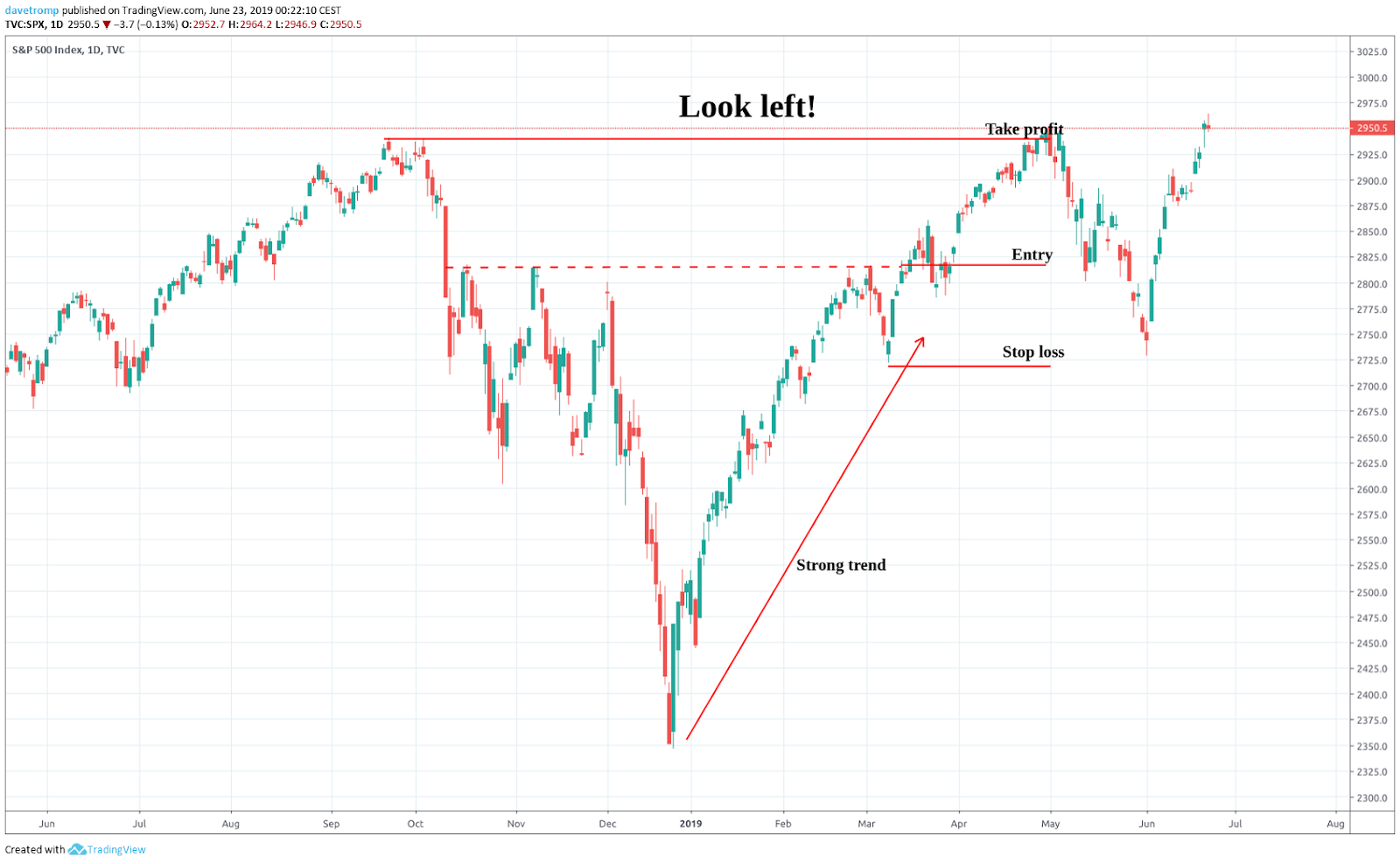 The above chart shows the OHLC prices over time for the S&P500. Let’s just see that I have spotted an entry and stop level as marked on the chart. All I have to do is look left and see if there are some obvious previous levels where the price reversed. Here on this chart, it was a very clear level. I usually place my take-profit order a bit before, in this case below, the level I found on the left.