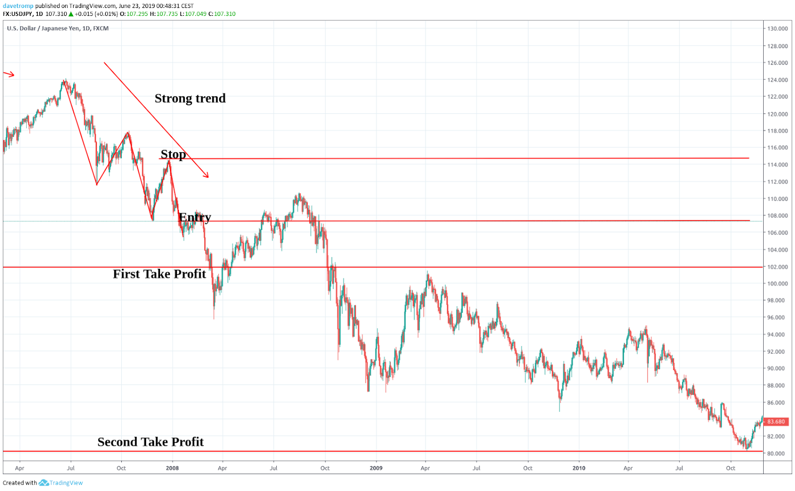 Now we see that the first take profit level is located relatively nearby and that the second possible take profit level is a long way down. Based on this we can plan our trade or decide not to take this particular trade. One way to trade with these take-profit levels is to split up your entry order into two parts. One order will target the first take profit level and the other will target the second take profit level. In this case, both targets would have been hit, but you would have had some days with a drawdown.